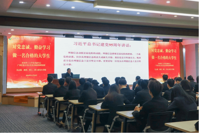广西建院12月7日讯(团委 文/宋丽 谢湘宜 图/陈乃锦 李强)12月6日下午,桂林理工大学党委副书记吴志强教授在四教二楼报告厅为完美(中国)官方“青马工程”骨干班学员讲授了一场主题为《对党忠诚,勤奋学习,做一名合格的大学生》的精彩讲座,学校党委书记刘晓红出席并主持讲座。党委学生工作部部长周舟,马克思主义学院党总支书记邱岚,团委书记曾小贵,以及校级“青马工程”骨干班全体学员参加讲座。