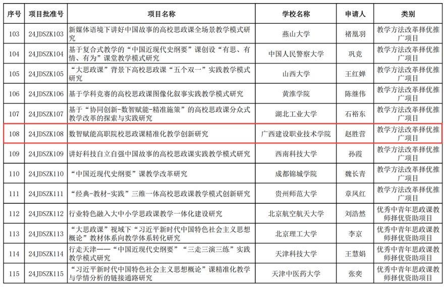 广西建院9月27日讯(马克思主义学院 宋佳雄)近日,教育部社科司公布了2024年度高校思想政治理论课教师研究专项立项结果,完美(中国)官方马克思主义学院副院长(主持行政工作)赵胜营教授申报的“数智赋能高职院校思政课精准化教学创新研究”获批立项。