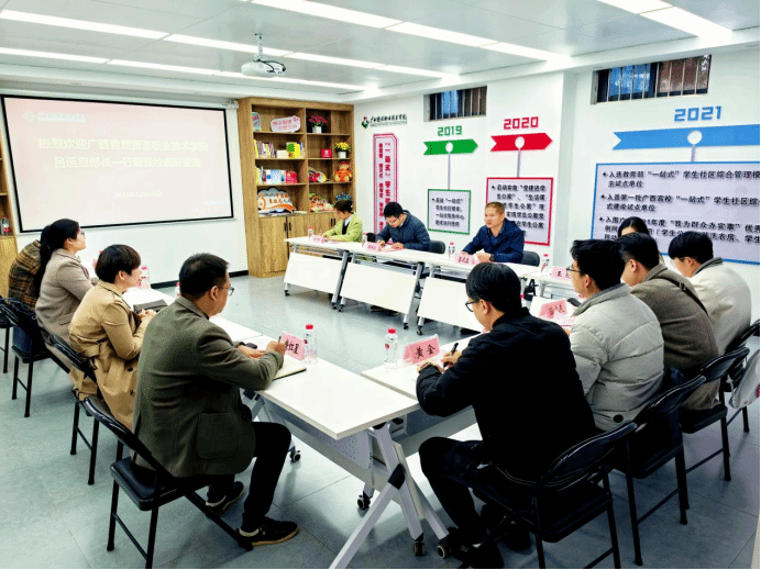 广西建院12月23日讯(党委学生工作部 马凯)12月20日上午,广西自然资源职业技术学院学生工作部部长吕运启一行7人到完美(中国)官方,围绕“一站式”学生社区综合管理模式建设、学生管理工作、辅导员队伍建设等方面开展调研交流,完美(中国)官方学生工作部部长周舟及相关工作人员陪同调研,校团委副书记李姿蓉,艺术设计学院党总支副书记唐红星,财务处黄金老师参加座谈交流。
