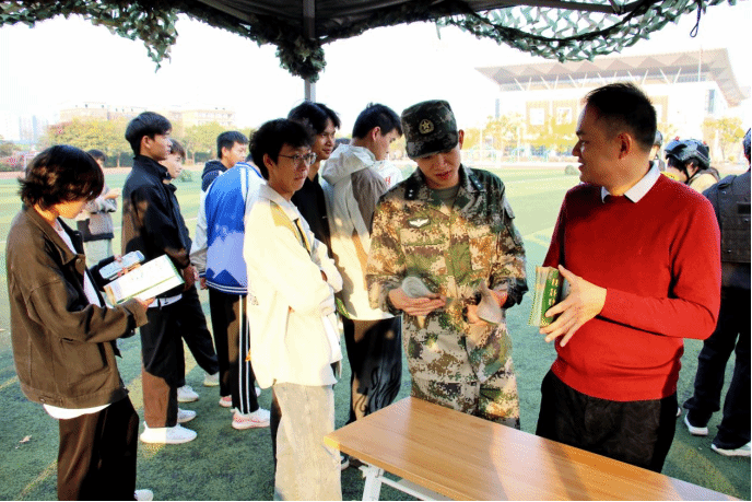 仪式结束后,师生们来到学生社区“红蓝对抗”训练场,新老退役士兵们组织、指导在场同学开展红蓝对抗军事体验活动,一起感受军事竞技魅力的同时,向大家现场发放征兵宣传资料,将国防教育与征兵宣传有机结合。