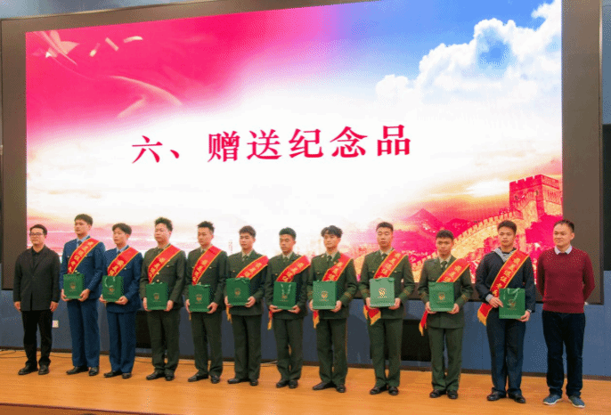 学校国防教育工作室主持人、退役士兵协会指导老师张悬鹏老师,学校党委武装部陆遥遥老师为退役复学生代表颁发了退役复学纪念品。