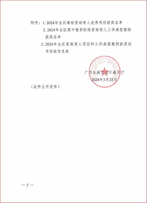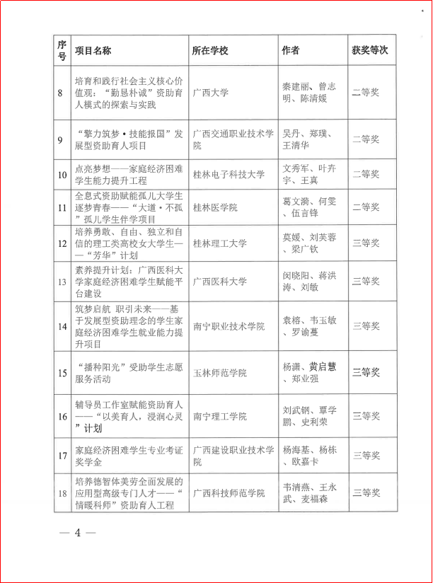广西建院4月7日讯(党委学生工作部 欧嘉卡 杨栋)近日,自治区教育厅印发《关于公布2024年全区资助育人项目和工作典型案例评选活动获奖名单的通知》(桂教资助〔2024〕4号),在全区高校范围内共评选出资助育人优秀项目20项。完美(中国)官方申报的项目《家庭经济困难学生专业考证奖学金》荣获“2024年全区高校资助育人优秀项目”三等奖。