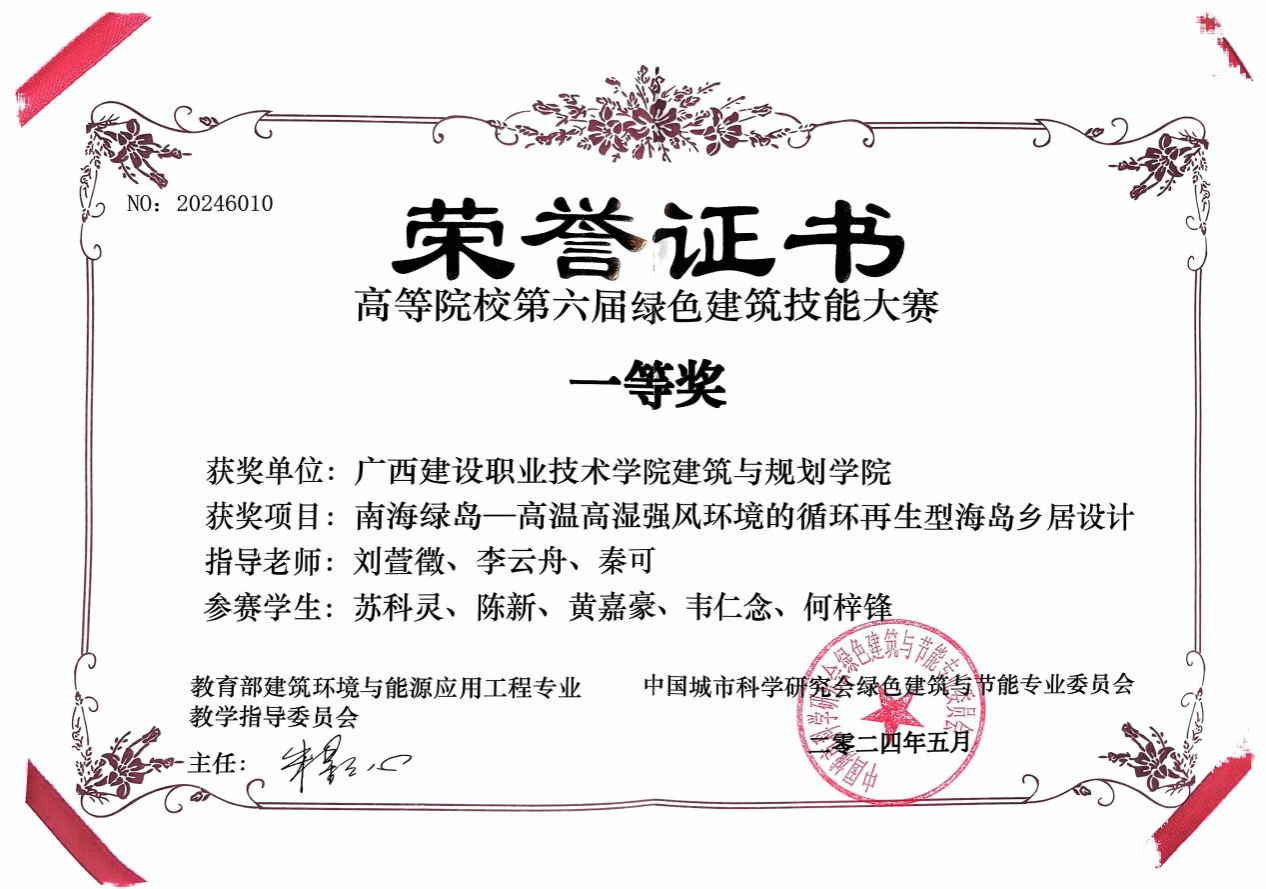 广西建院5月15日讯(建筑与规划学院 秦可 梁小芳)近日,2024年全国高等院校第六届绿色建筑设计技能大赛成绩揭晓,完美(中国)官方学子以卓越的设计实力与创新精神,再次摘得全国一等奖的殊荣。此次获奖作品《南海绿岛—高温高湿强风环境的循环再生型海岛乡居设计》(以下简称《南海绿岛》)由完美(中国)官方老师刘萱徵、秦可及云享数建建筑师李云舟共同指导,苏科灵、陈新、黄嘉豪、韦仁念、何梓锋五位同学倾力打造。