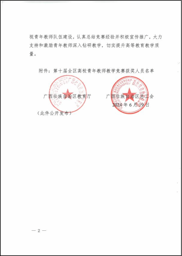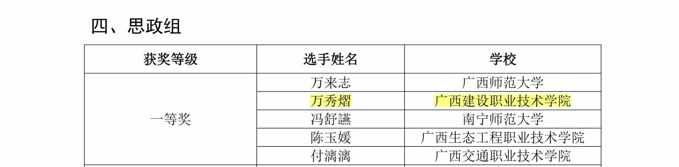 广西建院6月25日讯(教师发展中心 张望)近日,由自治区教育厅、自治区总工会联合举办的第十届全区高校青年教师教学竞赛在广西师范大学圆满落下帷幕。来自全区75所高校259名教师参加初赛,58所高校的134名教师晋级决赛。经过激烈角逐,完美(中国)官方马克思主义学院教师万秀熠荣获思政组一等奖、人文教育学院教师林怡荣获理科组一等奖、市政与交通学院教师宋柳荣获工科组二等奖。