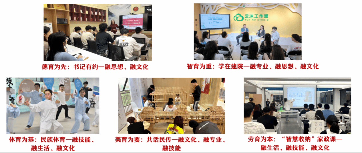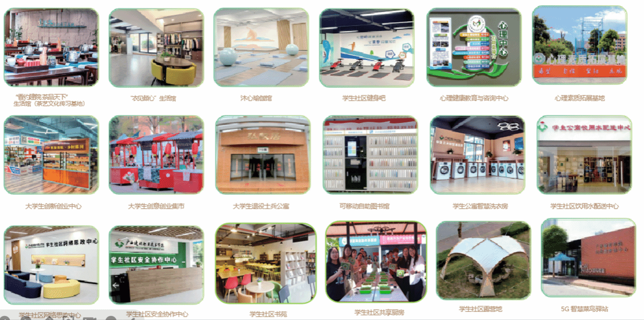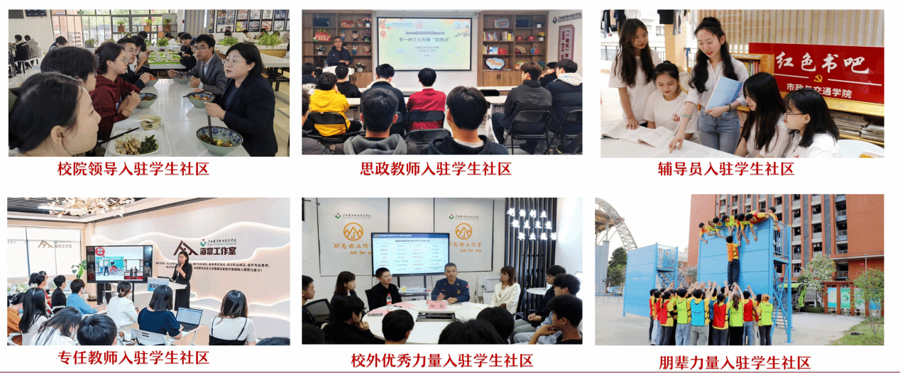 学校坚持以学生为中心,充分发掘、盘活现有物理空间,在学生宿舍区系统建成了涵盖思政教育、文化活动、学习指导、身心滋养、生活体验等5大类,共2万多平方米的42个社区育人空间,将思政工作触角全面延伸学生一线。创新队伍入驻机制,组建了31支学生社区功能空间运行管理队伍,形成了以辅导员为骨干,党政干部、思政教师、心理教师、专业教师、校外优秀力量和朋辈力量共同参与的常驻社区育人团队覆盖700余人,开创了社区全员育人新格局。探索社区育人模式,以“第二课堂成绩单”制度为载体,突出“理实结合”,围绕学生德智体美劳全面发展,在社区开设了长期性育人专栏活动100多个,举办了学生广泛参与、文化内涵丰富的各类活动超5000场,月均参与学生超1万人次,从中精选培育了社区课程25门,不断深化“融思想、融文化、融专业、融技能、融生活”的“五融一体”建院特色“一站式”学生社区建设。