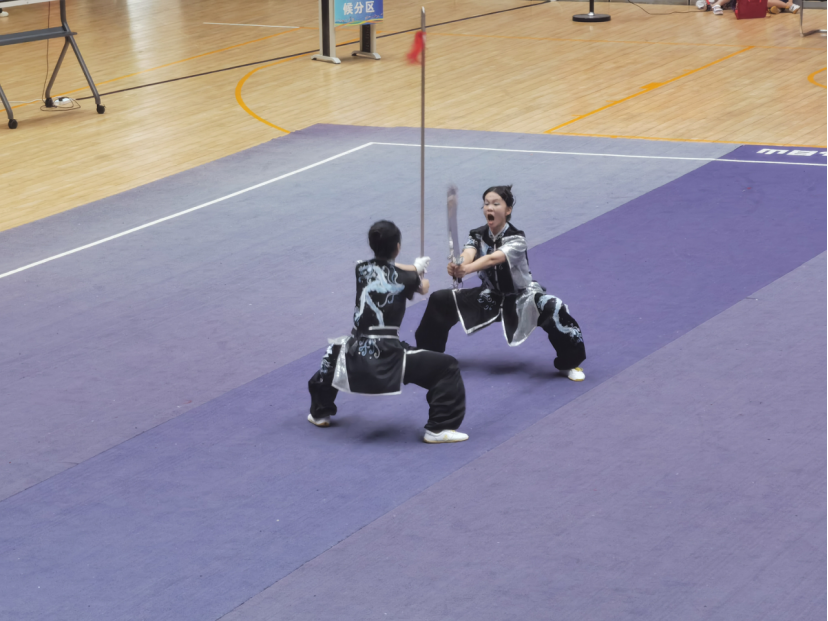 李宇晴(左)和覃柳丽(右)武术双刀进枪比赛现场