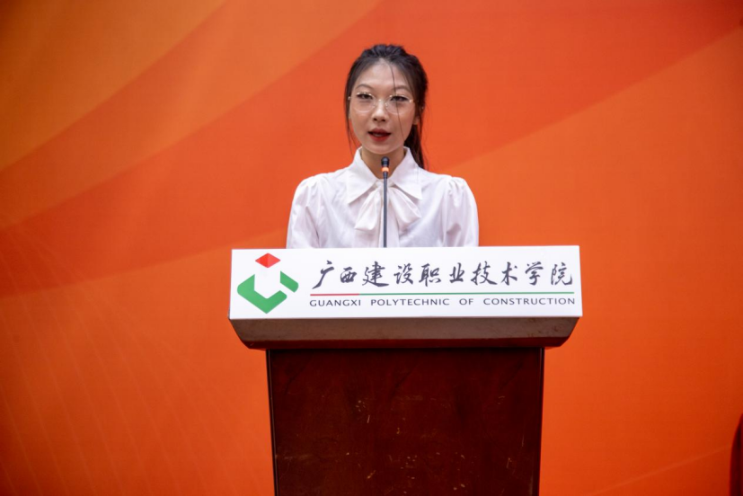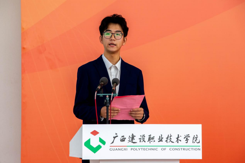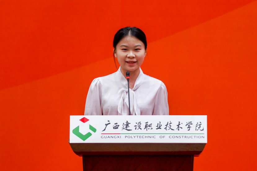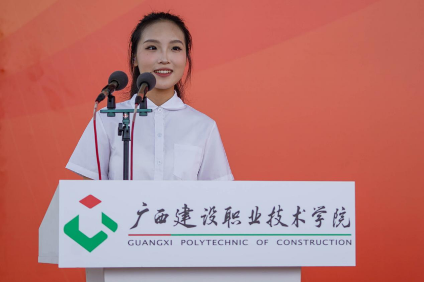 市政与交通学院检测2301班农雅麒作为在校生代表在相思湖校区开学典礼上发言。她向学弟学妹们分享了成长心得:“厚德于心,以善立身”“励学于行,以知促能”“敦行于事,以干成事”。艺术设计学院环艺2301班陈绍楠作为在校生代表在武鸣校区开学典礼上发言。她希望大家既能沉下心打磨技能,成为行业里的“行家里手”,又能抬起头望向远方,让自己的技能与国家发展同频共振。