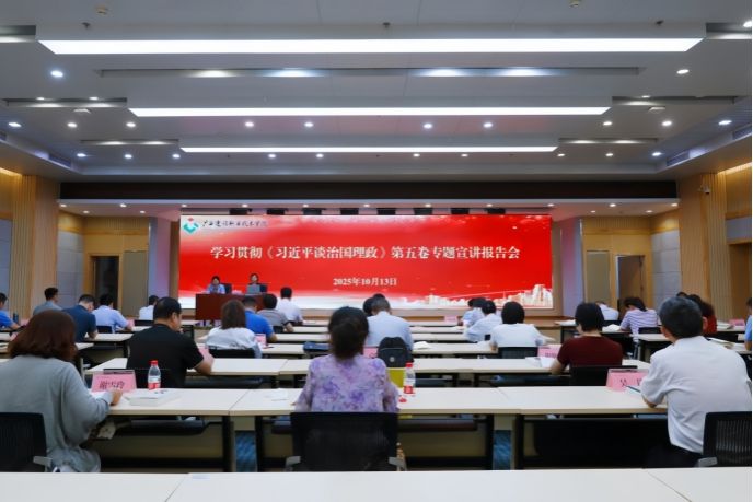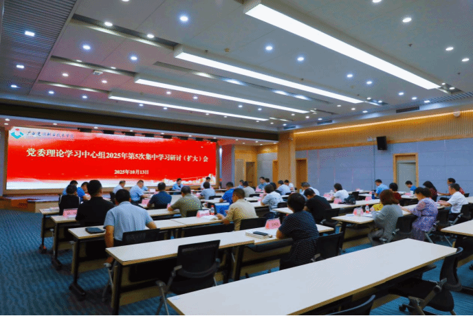 广西建院10月13日讯(党委宣传部 文/陈熙 图/韦植巍)10月13日,学校党委理论学习中心组2025年第5次集中学习研讨(扩大)会在四教二楼报告厅举行,会议认真学习《习近平谈治国理政》第五卷,聚焦“深学细悟笃行新时代党的创新理论,提升学校高质量发展的质效”开展集中研讨。学校党委书记刘晓红主持并讲话。