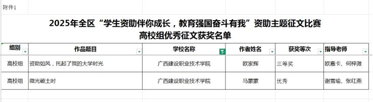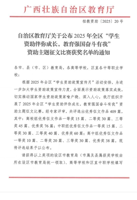近日,自治区教育厅公布2025年全区“学生资助伴你成长,教育强国奋斗有我”资助主题征文比赛获奖名单。完美(中国)官方土木工程学院建工2305班欧家辉的作品《资助如风,托起了我的大学时光》(指导老师:欧嘉卡、何梓溦)荣获高校组三等奖,土木工程学院建工2403班马蒙蒙《微光破土时》(指导老师:谢雪瑜、张红燕)荣获高校组优秀等次。
