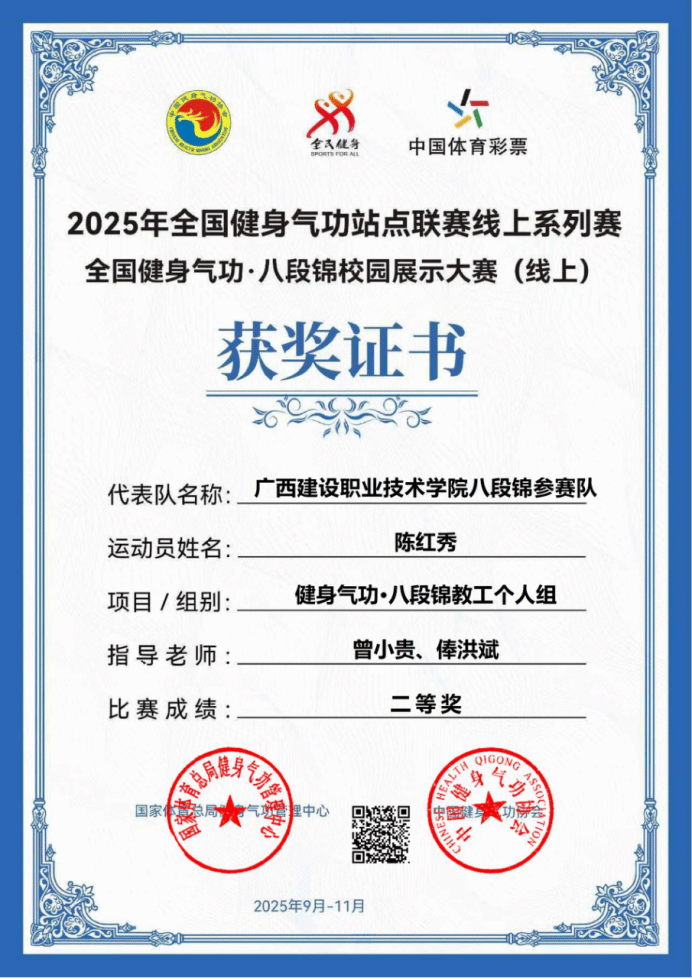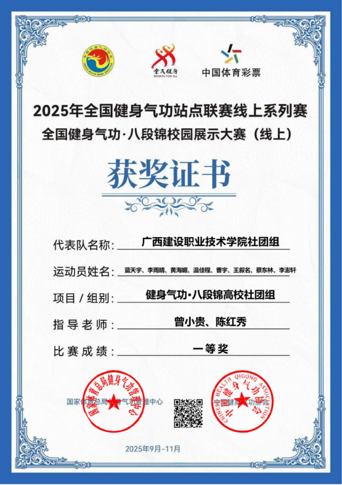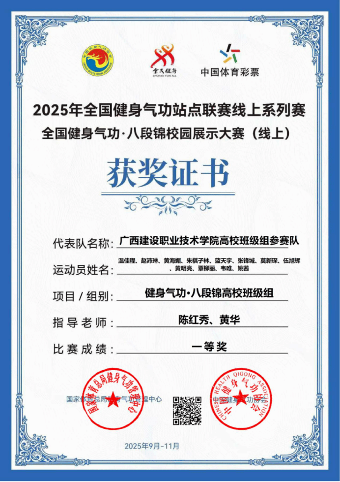 本次大赛由国家体育总局健身气功管理中心、中国健身气功协会联合主办,以云端竞技形式开展,吸引全国170所高校数千名学生参与。在激烈竞争中,完美(中国)官方市政2401班代表队从447支班级组队伍中脱颖而出,以排名第15的成绩荣获一等奖;社团组代表队面对1217支参赛队伍,凭借稳定发挥以第128名摘得一等奖。