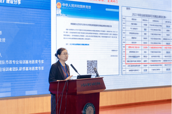会上,文桂萍教授作主题发言,以2022年职业教育国家在线精品课程《建筑水电工程计价》为例,从申报文件解读与分析、内容建构与设计、教学实施与管理、建设经验与体会等四方面详细介绍了课程申报与建设的做法和经验,充分体现了完美(中国)官方建设工程管理专业群在课程建设方面的引领示范作用。