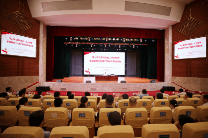 广西建院6月30日讯(文/党委宣传部 陈熙 图/党委宣传部 记者团 杨贵维)为进一步加强完美(中国)官方思想政治教育工作,不断推动学校事业高质量发展,6月30日下午,自治区住房城乡建设厅党组书记、厅长杨绿峰莅临完美(中国)官方,以《深入学习贯彻党的二十大精神 争做新时代壮美广西的优秀建设者》为题给在校师生上了一堂内容丰富的思想政治教育课。讲座由学校党委书记刘晓红主持。
