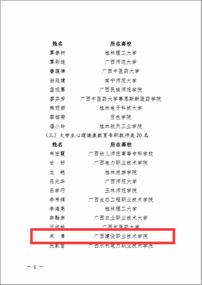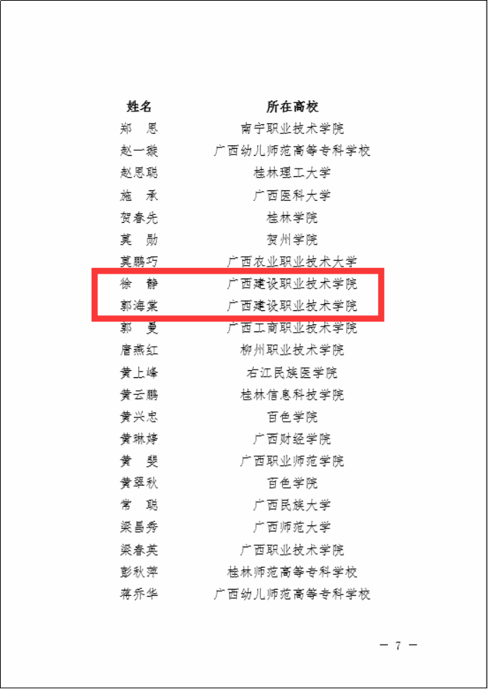 广西建院8月3日讯(管理工程学院 郭海棠 黄春)近日,广西壮族自治区教育厅公布了“广西高校思想政治教育卓越教师”支持计划第一期支持对象人选名单,完美(中国)官方党委学生工作部宋倩老师入选“骨干教师”(大学生心理健康教育专职教师类)、管理工程学院郭海棠老师和设备与环境学院徐静老师入选 “骨干教师”(专职辅导员类)。