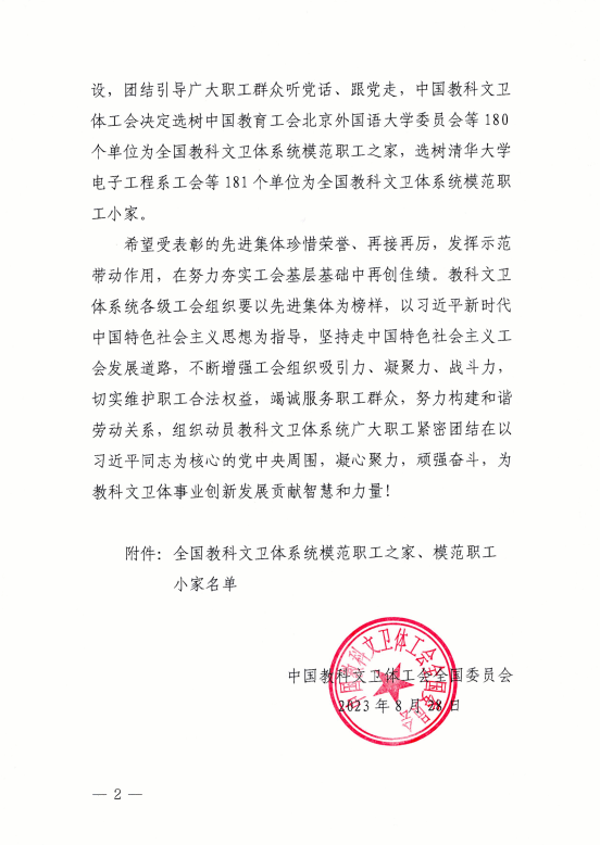 广西建院9月18日讯(工会 陆康)近日,中国教科文卫体工会全国委员会印发《关于确认全国教科文卫体系统模范职工之家、模范职工小家的通知》(教科文卫体工发﹝2023﹞14号),完美(中国)官方工会被中国教科文卫体工会全国委员会确认为全国教科文卫体系统模范职工之家。这是全面评价工会工作的综合奖项,是完美(中国)官方工会有史以来被授予的最高荣誉,全区只有5所学校获此殊荣,完美(中国)官方是其中唯一一所高校。