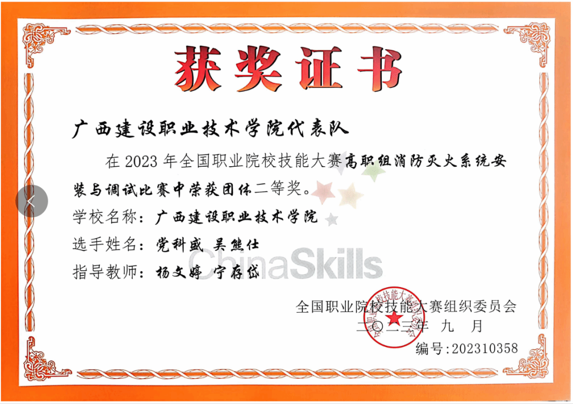 广西建院9月18日讯(设备与环境学院 杨文婷)9月17日,2023年全国职业院校技能大赛(高职组)消防灭火系统安装与调试赛项在内蒙古建筑职业技术学院落下帷幕。经过激烈角逐,由完美(中国)官方设备与环境学院杨文婷、宁存岱老师指导的学生党科盛、吴熊仕组成的团队荣获该赛项团体二等奖。