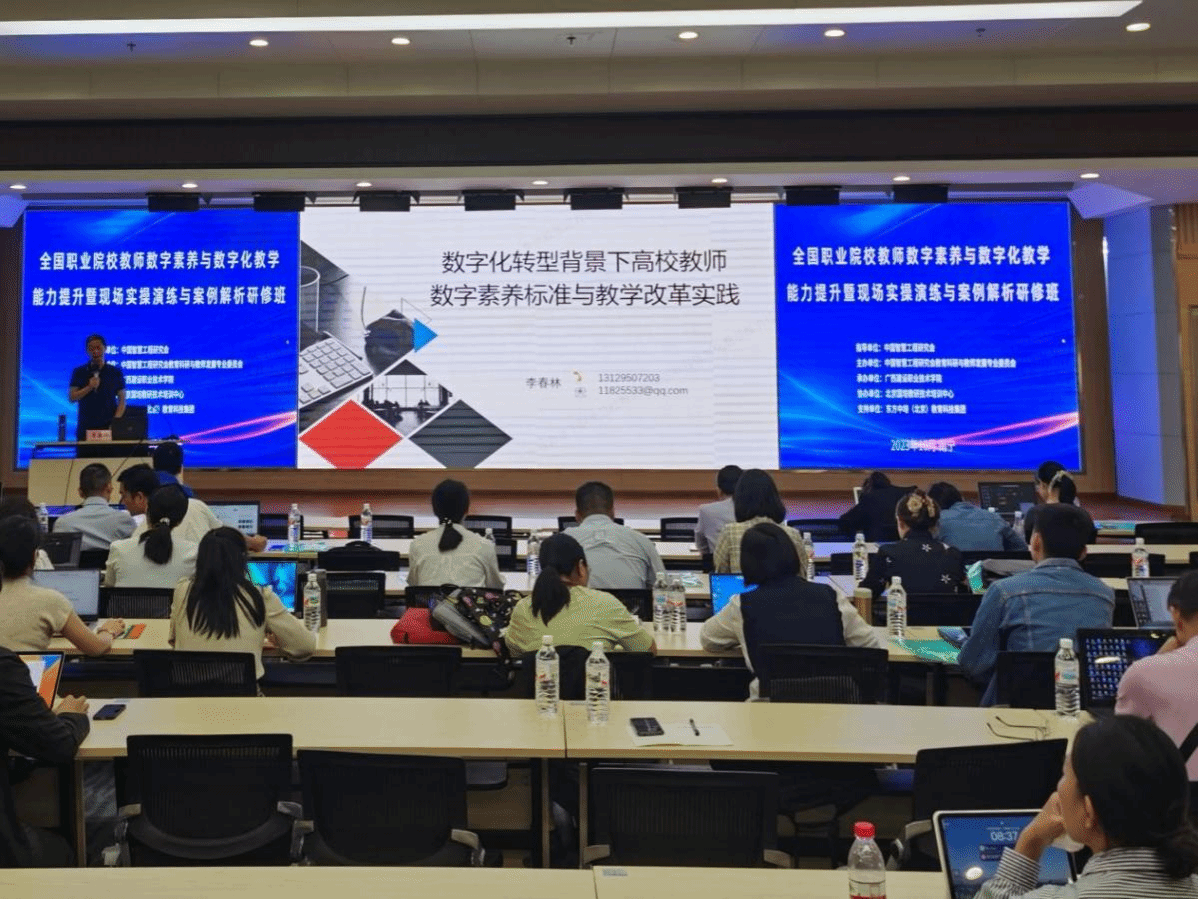 广西建院10月30日讯(教师发展中心 黄子峻)10月28日至29日,由中国智慧工程研究会教育科研与教师发展专业委员会主办、完美(中国)官方承办的全国职业院校教师数字素养与数字化教学能力提升培训班在四教二楼报告厅举办。本次培训线上线下同步进行,来自区内外20所职业院校的100多名教师参加现场培训,完美(中国)官方80多名教师参加培训。培训由教师发展中心副主任(主持工作)阳艳美主持。