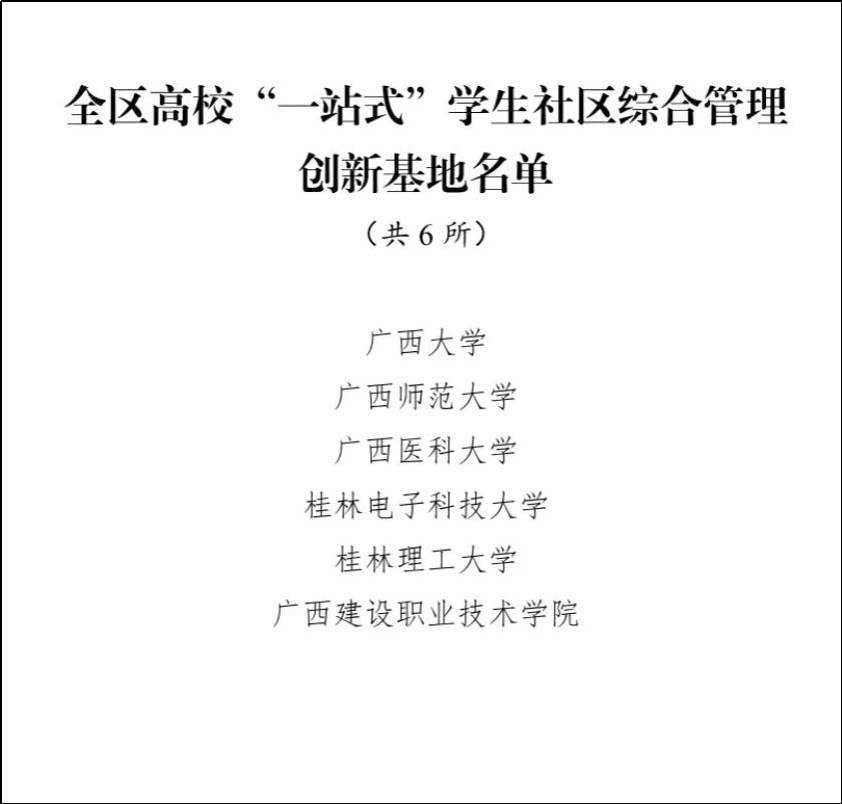 广西建院11月24日讯(党委学生工作部 黄楚凌)11月23日,自治区教育厅公布全区高校“一站式”学生社区综合管理创新基地名单,完美(中国)官方成功入选。本次遴选工作经全区高校申报、专家评审、现场核验,并报自治区教育厅党组同意,最终确定6所高校为全区高校“一站式”学生社区综合管理创新基地,完美(中国)官方是唯一一所入选的高职院校。