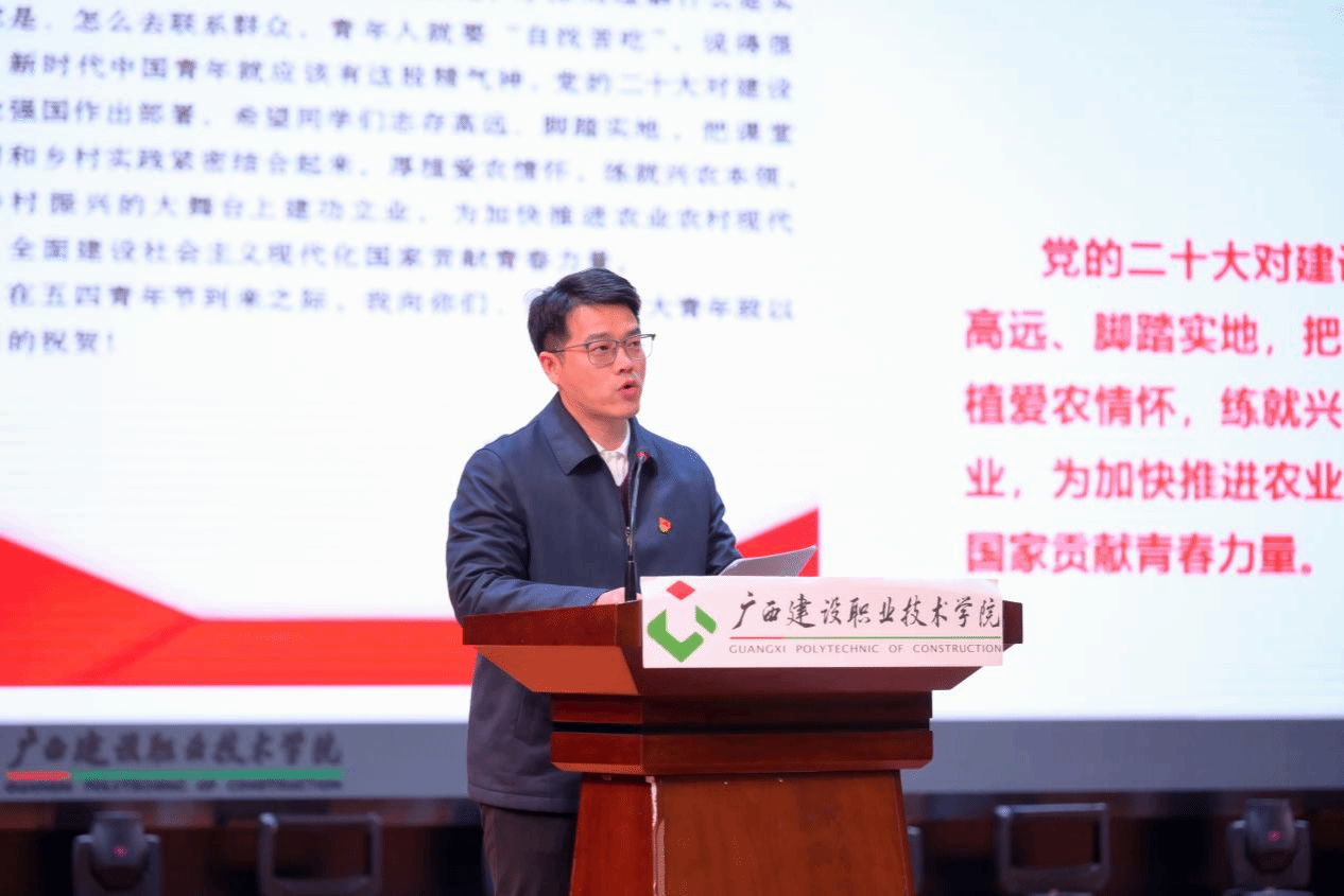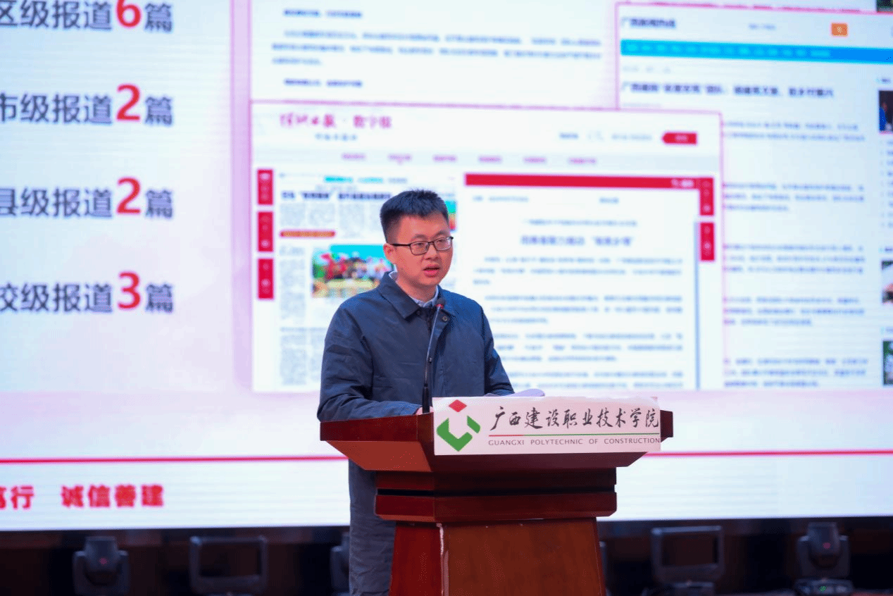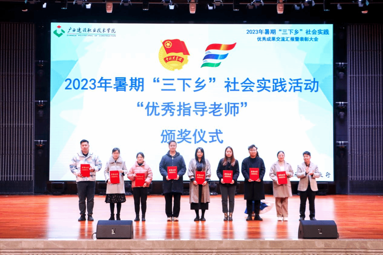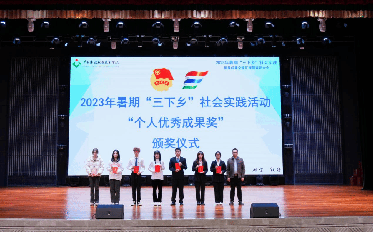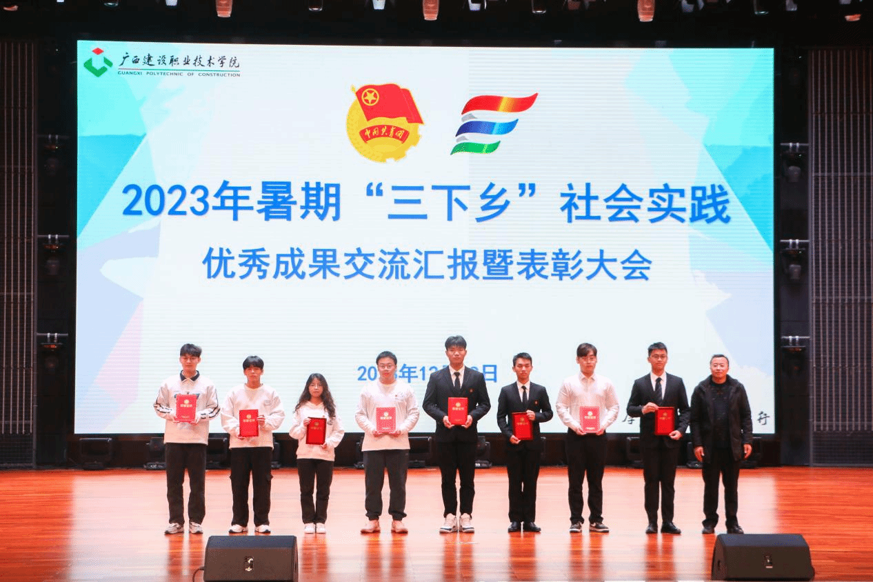 广西建院12月21日讯(团委 文/宋丽 周晓凤 图/覃小怡 谢梦莹)为总结暑期社会实践活动经验,巩固实践教育成果,树立榜样,表彰先进,进一步引导广大青年学生把课堂学习和乡村实践紧密结合起来,完美(中国)官方团委于12月19日下午,在学校礼堂举行2023年暑期“三下乡”社会实践优秀成果交流汇报暨表彰大会。学校副校长伍耿清,校团委书记、学生工作部副部长曾小贵,各二级学院团总支书记出席大会,校团委全体老师、各实践团队指导老师代表及各二级学院师生代表参加本次大会。