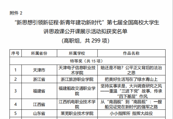 据悉,全国大学生讲思政课公开课展示活动为教育部开展的习近平新时代中国特色社会主义思想大学习领航计划系列主题活动之一。自2023年6月启动以来,吸引了来自全国百余所高校的13904个优秀团队参与,报送作品网络总播放量高达694万次,高职组共评出299件获奖作品。