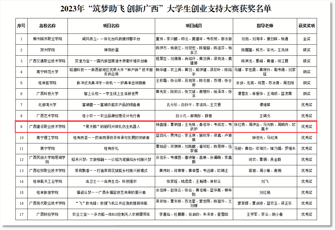 广西建院3月5日讯(党委学生工作部 文/杨栋 图/张红燕)近日,自治区教育厅公布2023年“筑梦助飞 创新广西”大学生创业支持大赛获奖名单,完美(中国)官方学生钟鑫强、覃炳雄、王先栋、秦修华、韦成志、韦武护在教师张红燕、周伊含、冯光帆、周晓卉、欧嘉卡的共同指导下,参赛项目《“黑天鹅”钢筋网片绑扎仿生机器人》荣获优秀奖。