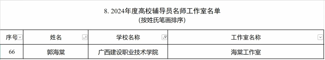 广西建院4月18日讯(管理工程学院 封炫妃)近日,教育部发布《2024年度高校思想政治工作质量提升综合改革与精品建设项目入选名单的通知》,完美(中国)官方郭海棠老师主持建设的“海棠工作室”成功入选首批高校辅导员名师工作室(全国80个)。