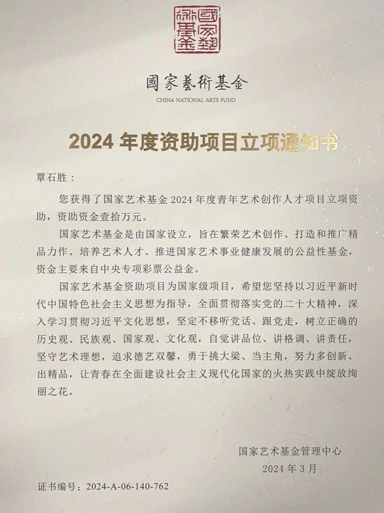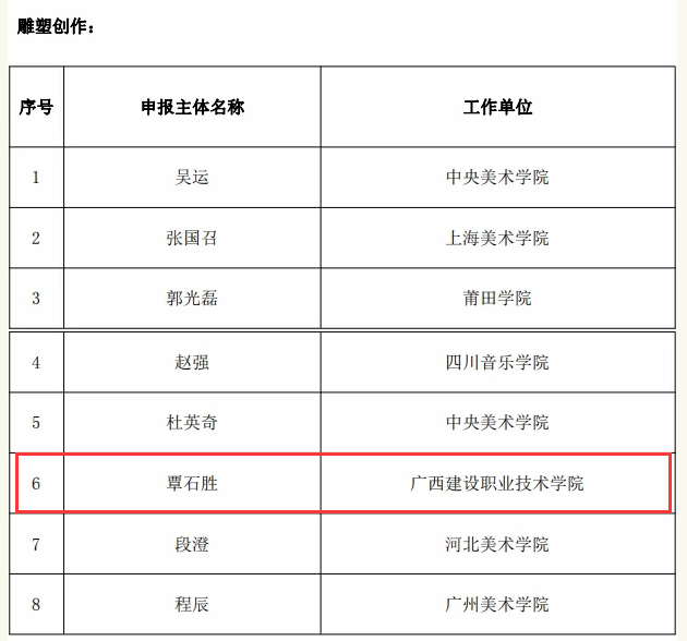 广西建院5月24日讯(艺术设计学院 高翔)近日,国家艺术基金管理中心公示了国家艺术基金(一般项目)2024年度资助项目名单,完美(中国)官方艺术设计学院覃石胜老师入选青年艺术创作人才资助项目。这是此次资助项目评审全区高职高专入选的唯一作品,也是完美(中国)官方获得的首个国家艺术基金资助项目。