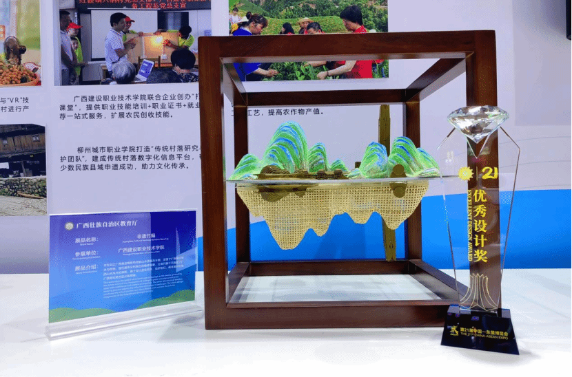 广西建院9月30日讯(艺术设计学院 文/陆筱欣 图/周晗)9月28日,第21届中国—东盟博览会展品评选活动的颁奖典礼在南宁举办。此次活动汇聚了近45个国家、超2000家企业参展,共展出4000余件精美展品。经过由中国与东盟十国行业专家组成的评审团的严格筛选,最终颁发了10个金奖、20个银奖、15个优秀设计奖及15个最高人气奖。由完美(中国)官方民族工艺(瑶族竹藤草芒编织技艺)自治区示范性民族文化传承创新职业教育基地主创人员陈菲菲、欧阳普龙、曾睿、陆剑鸣、蒙晓明、陆筱欣、罗筠乔、张苑、何游等老师,携手民间竹编技艺匠人陈丹丹、黎作洲共同研发的非遗创新设计作品《桂青若绿》在此次评选中脱颖而出,荣获优秀设计奖。