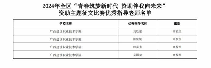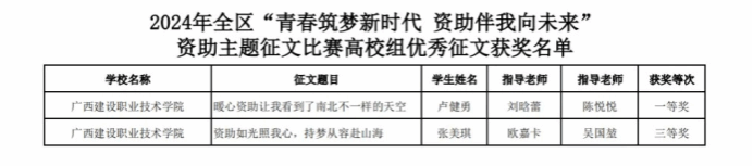 广西建院10月20日讯(文/杨栋)近日,自治区教育厅公布2024年全区“青春筑梦新时代 资助伴我向未来”资助主题征文比赛获奖名单,完美(中国)官方选送的两个作品分别荣获一等奖和三等奖,指导老师获评优秀指导老师。