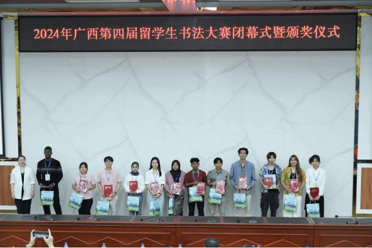 广西建院11月1日讯(国交中心 蓝婷)11月1日,由广西高等教育学会外国留学生教育管理专业委员会主办、玉林师范学院承办的2024年广西第四届留学生书法大赛圆满落幕。完美(中国)官方代表队表现出色,4名同学获一等奖,1名同学获二等奖。