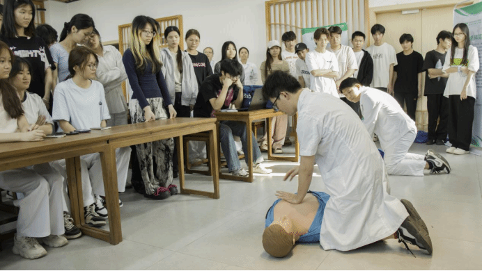 活动中,医护人员通过理论讲解与实操演示,为学生普及了心肺复苏(CPR)和海姆立克急救法,强调“黄金救援时间”的重要性。