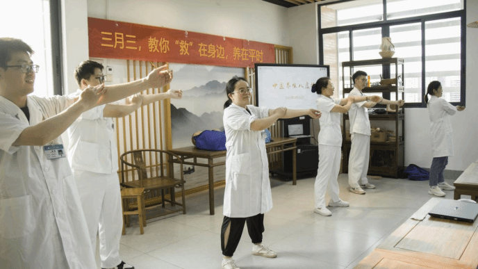 此外,医护人员还带领师生体验八段锦养生功法和拍八虚传统疗法,深入浅出地讲解中医“治未病”理念。学生们在舒缓的动作中感受中医文化的独特魅力,进一步增强了文化自信。