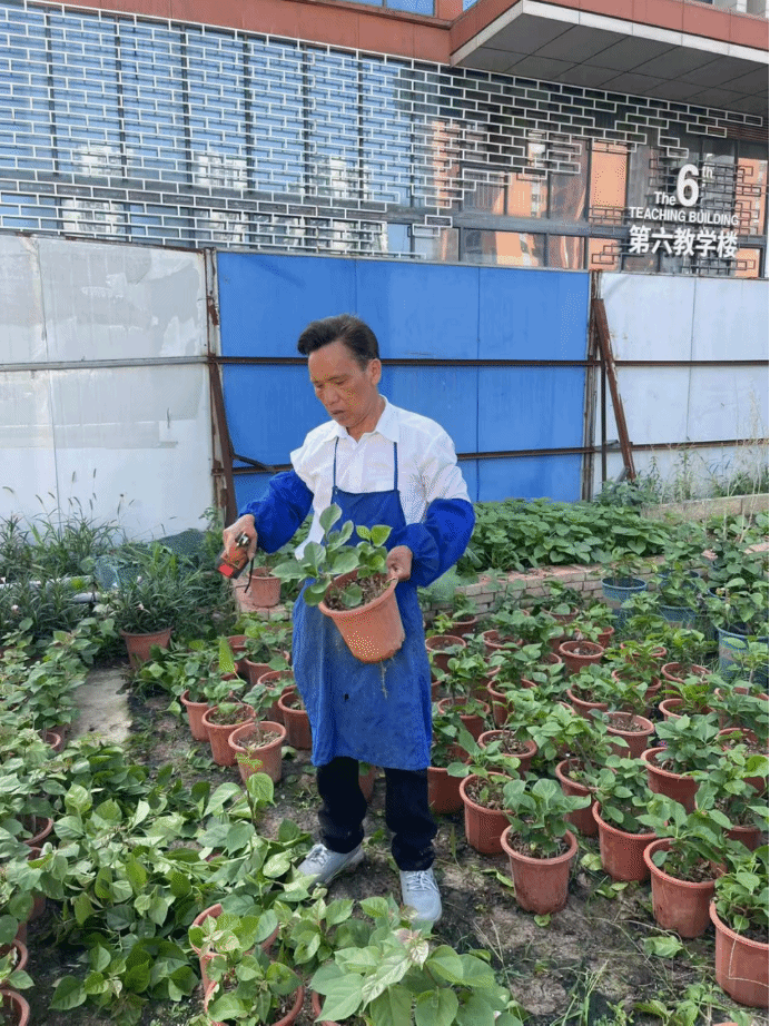 校园每一寸土地上,都留下了袁师傅的足迹。清晨的露水沾湿他的衣角,正午的骄阳晒黑他的脸庞,暮色中的身影仍在悉心修剪枝叶。从青葱少年到鬓染霜雪,他将自己的青春与热忱,都倾注到了这片校园绿茵中,为全校师生打造出四季如春的优美校园环境。