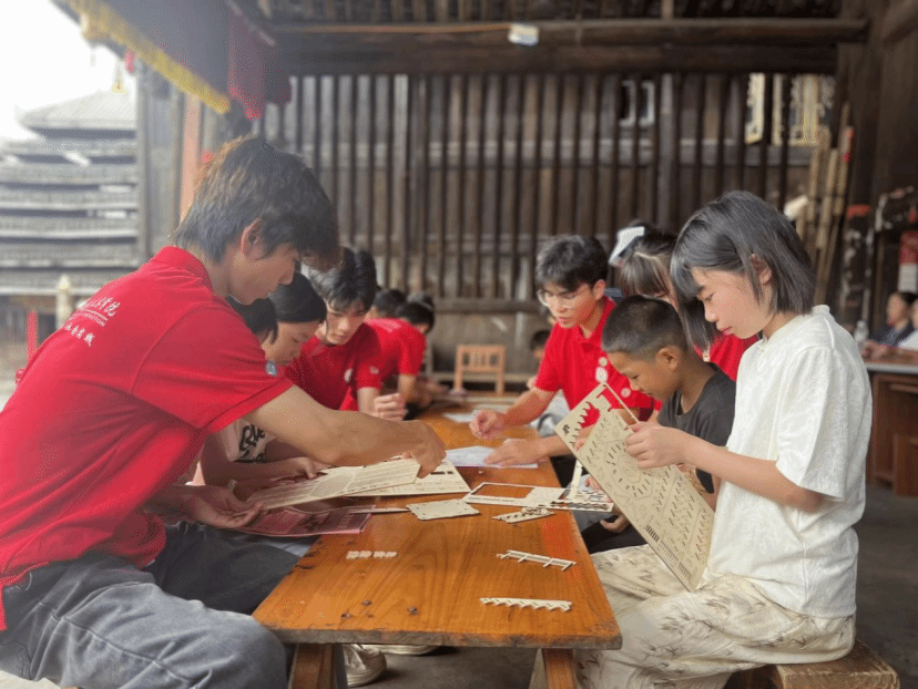 完成一座吊脚楼模型,不仅是对专业技能水平的考验,更是对“工匠精神”的切身体悟。同学们将这份感悟化为服务乡村、文化惠农的行动,组织村寨儿童开展鼓楼模型制作活动。大手牵小手,在欢声笑语中,非遗技艺的种子悄然播撒,文化传承的接力棒在代际间传递。这堂“动手课”,让“知行合一”的理念在躬行中淬炼升华,更在孩子们心中植下了热爱家乡文化、守护乡村文脉的种子。