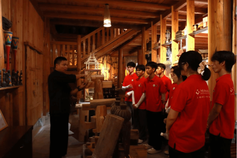 实践团首站来到由国家级非遗“侗族木构建筑营造技艺”传承人杨恒金创办的杨恒金侗族木构建筑博物馆,系统学习国家级非遗“侗族木构建筑营造技艺”的发展历程,鼓楼、风雨桥等标志性建筑的营造原理以及榫卯结构的力学智慧与现代价值。实践团参观了明清至今的侗族木构模型、百年营造工具及榫卯结构实物等千余件展品,“从图纸绘制到木料选材,每一步都透着‘精益求精’的工匠精神。”实践团成员韦艺锋同学感慨。