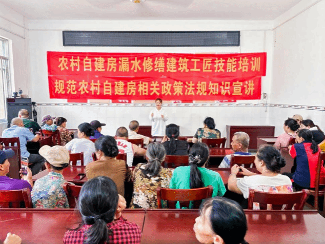 通过前期调研得知当地村民缺乏房屋修缮的技能,实践团面向村民开展了农村自建房漏水修缮建筑工匠技能培训,现场讲解“清基处理—防水材料铺设—密封涂浆”三步标准化修缮流程,指导村民掌握防水涂料配比、施工工具使用等关键技术。有参与培训的村民工匠主动询问:“你们这校服是广西建院的吧?前些年你们教的方法我们村有人用了,效果好!”实践团通过开展培训,不仅传递了技能技术,更播下了乡村自我“造血”、长效维护宜居家园的希望种子。