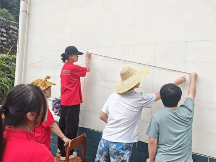 7月14日,村委会一面10.1米宽、3.5米高的白墙成了队员们的“主战场”。35℃高温下,大家分工协作:寻来废弃的上下床代替脚手架勾勒高处线稿,仔细测量比例,用粉笔精准构图。