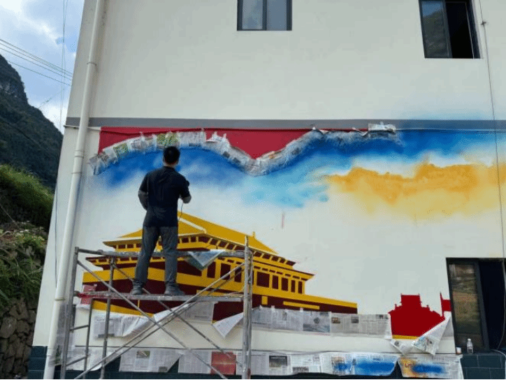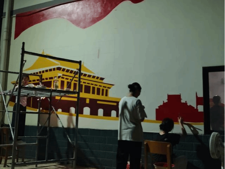 午后骤雨突袭,豆大的雨点砸落。“线稿不能冲掉!”短暂的焦灼后,大家更加专注。雨停时,完整的线稿已牢牢定格在墙上。随后的四天,队员们开启“加速模式”:鲜亮的红与庄严的金被精心调制,华表柱的纹路由勾线组细细描摹,填色组让红绸与天安门轮廓逐渐立体。指导老师甚至用喷枪绘出蓝天暖云。夜晚,村委会灯火通明,队员们借助路灯微光完善细节,直至完美呈现。