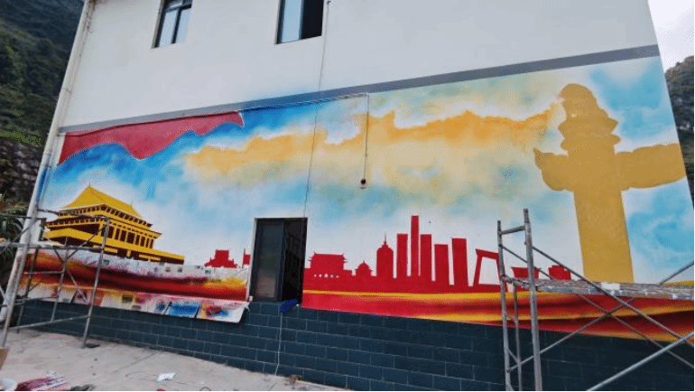 最终,斑驳的白墙焕然一新:涌动的红绸、闪耀金光的天安门、诉说传承的华表柱、勾勒奋进脉络的城市剪影,构成一幅壮丽的画卷。“这画真好看!”“上面的字我们都认得!”路过的村民纷纷驻足感叹,这里成了村里最亮眼的文化阵地。