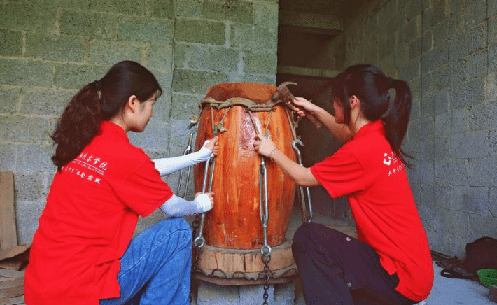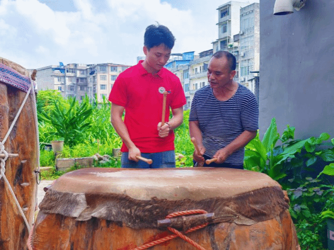 实践团深度参与会鼓制作全流程:从选材识料、挖凿鼓身,到蒙皮固定、自然风干。在蓝庆阳老师的指导下,队员们亲手处理樟木鼓身、上等黄牛皮鼓面,在“选材—蒙皮—晾晒”的完整工艺中体悟“一鼓一世界”的匠心。成员小李感慨:“每一道工序都是时间与技艺的对话。”