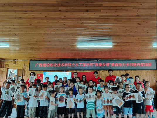 “育美乡情”实践团与三江县杨恒金侗族木构建筑博物馆共建“大学生美育实践基地”,为三江县平岩村儿童精心设计美育支教课程,结合当地侗族文化,面向当地儿童开展侗族传统建筑绘画、多耶舞表演、木结构搭建、普通话培训等为期3天覆盖至少230人次的美育支教活动。实践团成员与当地儿童共创了70件表现侗族建筑的美术作品和80份少数民族纹样作品,与孩子们共同排练了当地侗族的多耶舞,搭建了3件大型木结构建筑模型,并举办了2场美育支教成果展,还自发筹款向侗族儿童捐赠水彩笔等美育教学用具100套,充分表达了对当地少数民族儿童的关心与关爱。