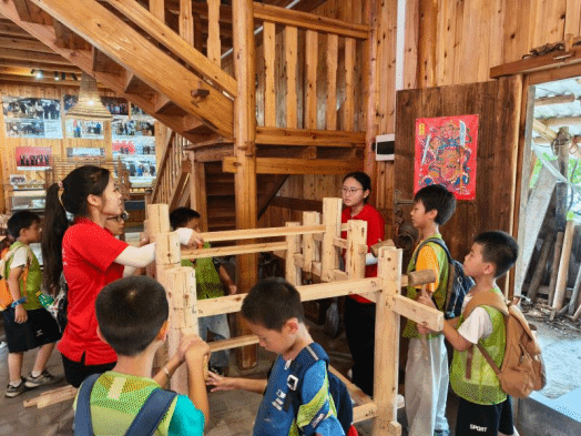 实践团成员指导当地小朋友搭建大型木结构建筑模型