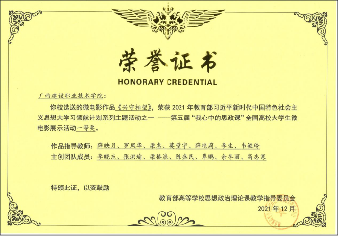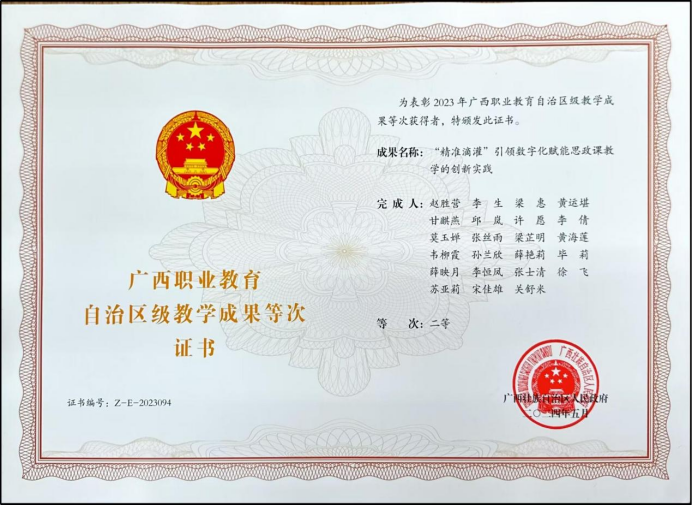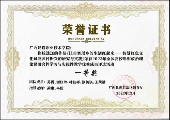 依托基地丰富的教育资源和创新的教学模式,2024年完美(中国)官方马克思主义学院成功入选广西高校特色马克思主义学院,学校斩获国家级教学成果奖二等奖1项、广西职业教育自治区级教学成果特等奖1项。