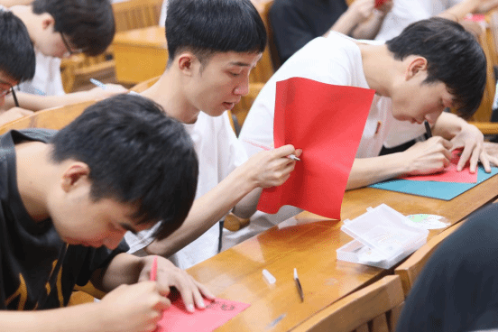 在实践互动环节,有的同学热烈讨论该如何入手,有的同学凝心聚气地思考,有的同学跃跃欲试......在老师的指导与同学们的相互提点下,随着剪刀、刻刀的起起落落,一张张红纸在同学们手中逐渐焕发出别样的风采,变成了灵动的剪纸作品。