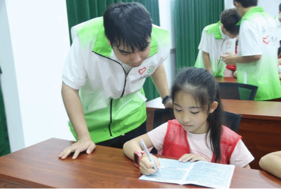 志愿者指导小朋友填写《研学手册》
