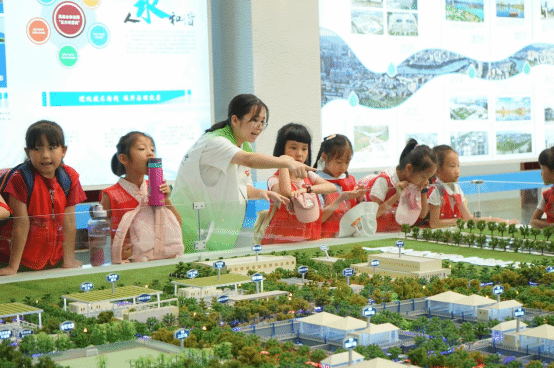 志愿者向小朋友讲解沙盘模型