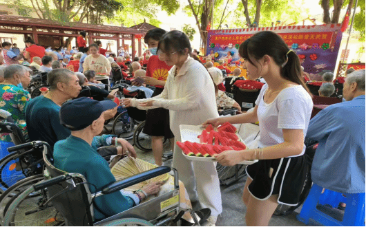 活动中,参与志愿服务活动的同学为养老院的老人送上爱心,将提前制作完成的40把折扇送给老人,驱散烈烈炎日的高温。活动当天正值金太阳老年公寓举办一月一次的生日会,志愿者们帮助现场工作人员做好生日会现场布置。生日会上,志愿者们与老人们促膝围坐,面对面亲切交谈,认真倾听老人们在养老院中的生活状况,共同奏唱《生日快乐》歌,为养老院增添了欢乐的气氛。