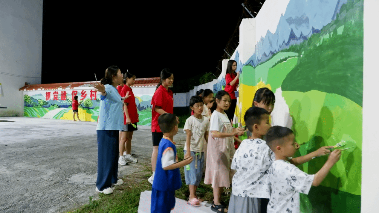 迎难而上,攻坚克难。实践团快速投入行动,清理墙面,刷漆奠基,设计方案,构图调色,上色维护,有条不紊。实践团的活动,引来了不少村民和孩童围观,大人们观看欣赏,孩童们纷纷上阵,协助绘制。