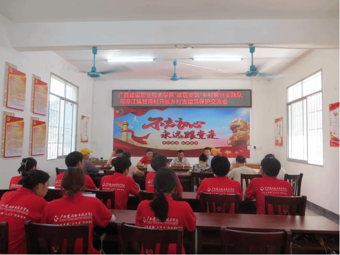 为充分尊重都安县历史文化,保存古建筑所在村落原始风貌,在开展古建筑保护修缮实践前,“故居安筑”团队认真查阅收集都安县古建筑的整体概况,制定了考察路线。到达都安县后,团队先后在都安县团委、澄江镇甘湾村村委与当地干部开展乡村古建筑保护交流会。