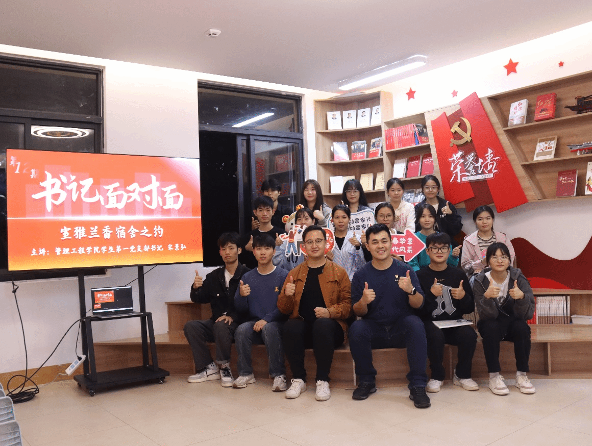 广西建院11月29日讯(管理工程学院 黄春 宋景弘)大学生宿舍是大学生共同学习、生活的场所,也是培养大学生良好生活习惯、体现大学生综合素质的一个重要窗口。11月27日,管理工程学院在“红船精神”学生公寓党建工作室开展第12期“书记面对面”活动,学生第一党支部书记宋景弘以“室雅兰香宿舍公约”为主题与在校学生代表开展面对面交流,学院团总支副书记孙文到场参与活动。