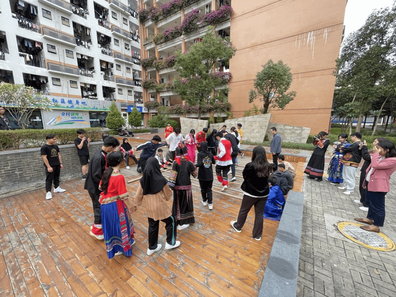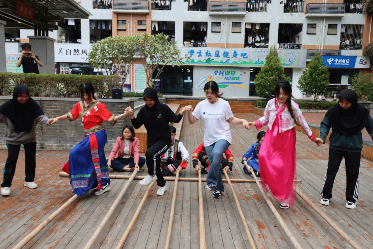 时逢腊月,冬日的校园依旧温暖如春,30余名同学们穿上属于自己民族的服装,与老师们一起来到健身吧广场。梁金来老师向同学们介绍了竹竿舞的文化,高杨杨老师现场教同学们辨识竹竿舞的节拍,市政学院的同学现场演示了竹竿舞的跳法,并邀请留学生们一同参与。